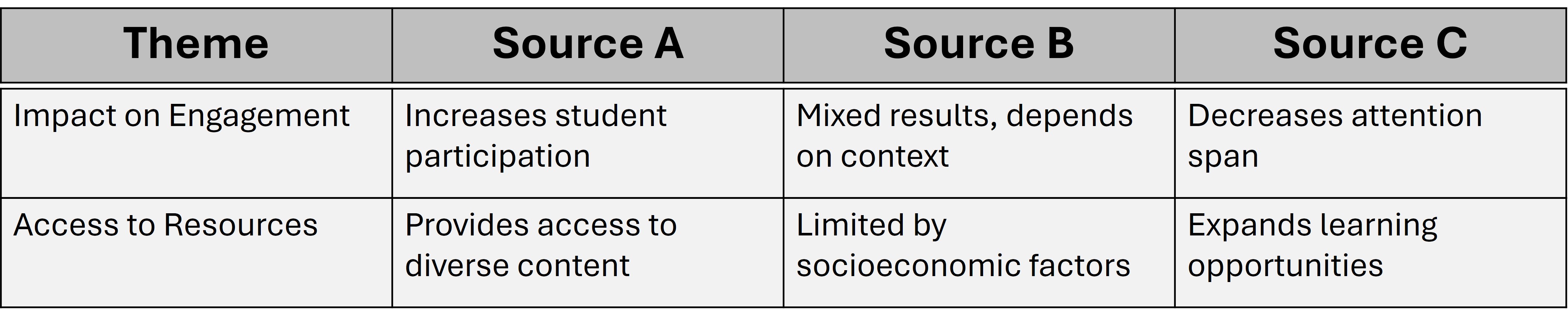Use a synthesis matrix to organize information from different sources by themes or key points.