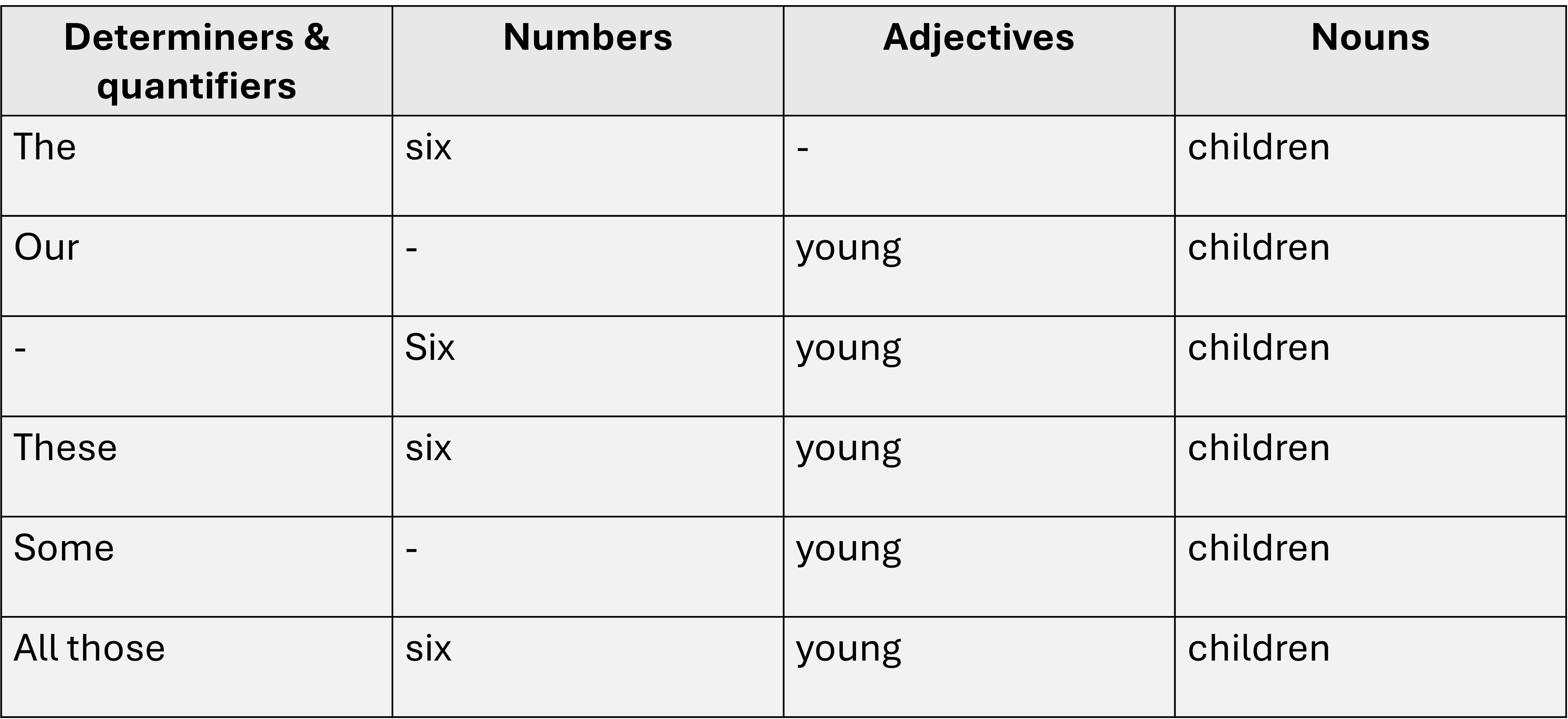 determiners and quantifiers → numbers → adjectives → nouns